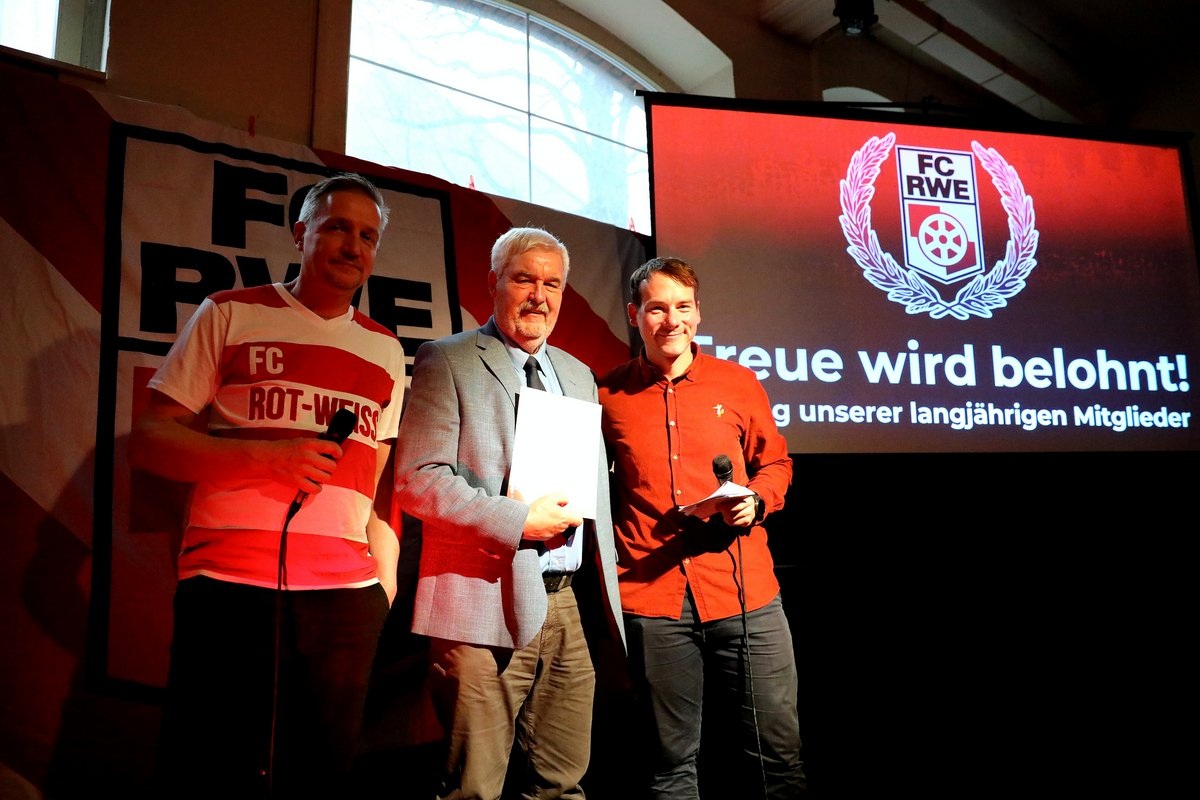 Auch zwei Männer, ohne die Rot-Weiß heute deutlich anders dastünde, wurden gewürdigt: Olaf Schwertner, für seinen großzügigen Verkauf wichtiger Medaillen und Urkunden an Rot-Weiß, und Kurt Gaida, der die von ihm vor der Entsorgung geretteten Pokale und Urkunden an RWE übergab.