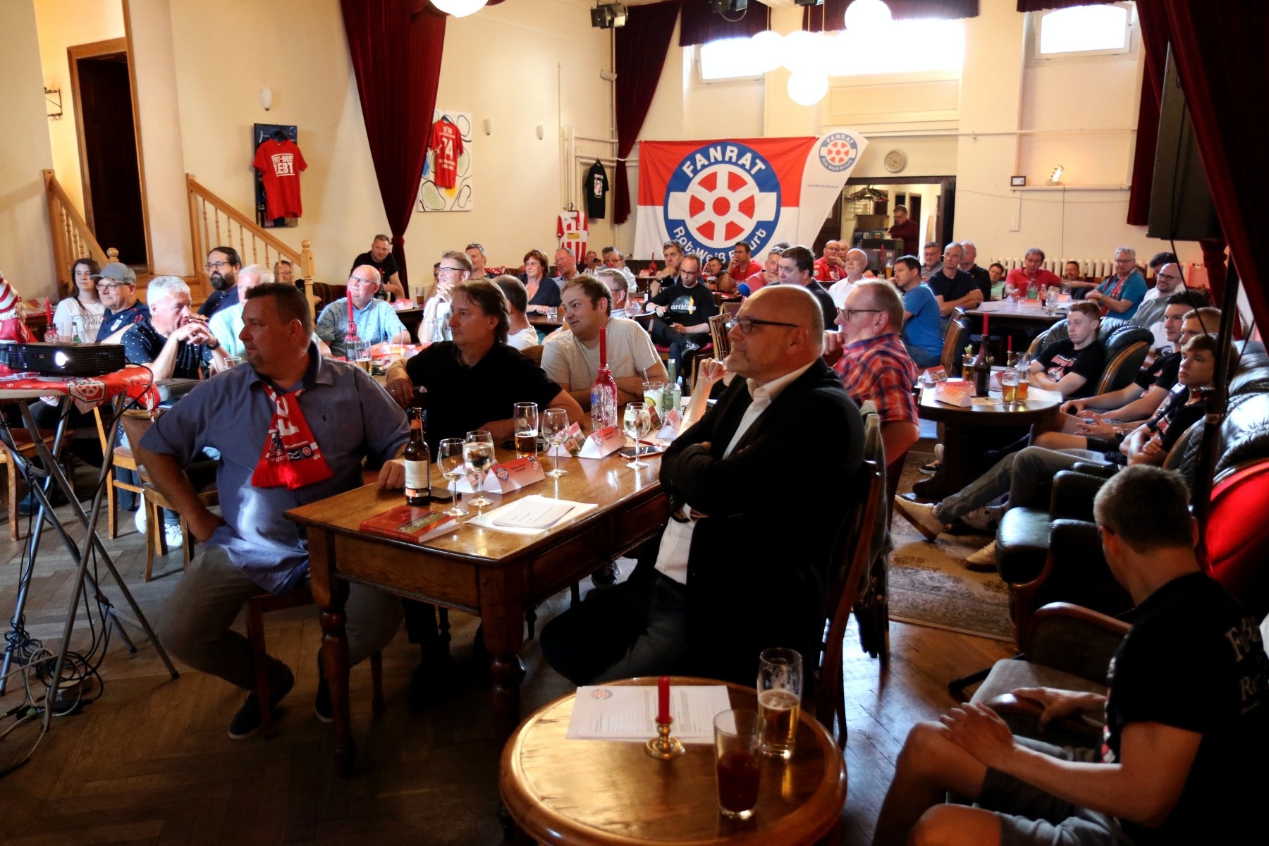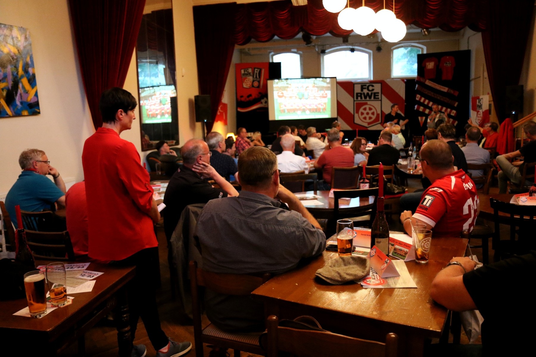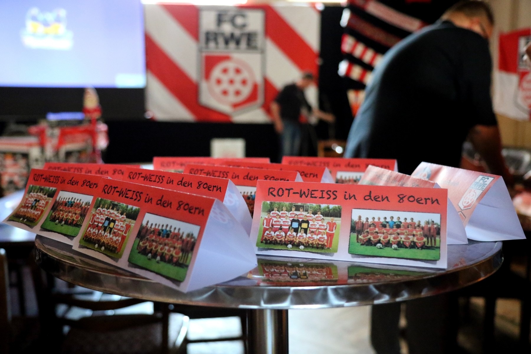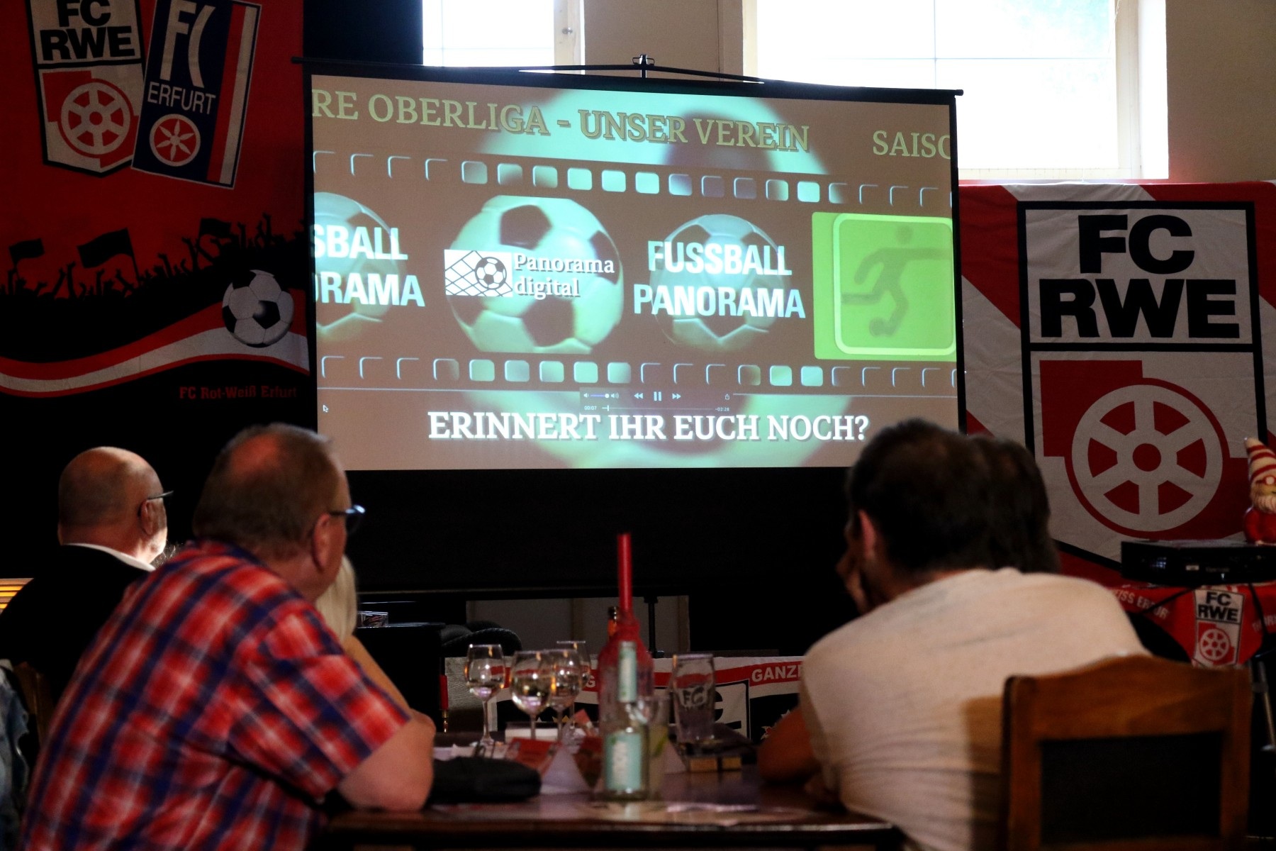 Nach dem erfolgten Ehrungen begaben sich die Gäste im Café Nerly, zu denen mit Luca Petzold, Jan Lucas Bärwolf, Til Linus Schwarz und Patrick Aguilar Alvarez auch vier Spieler der aktuellen Aufstiegsmannschaft zählten, auf eine Zeitreise in die 1980er Jahre. Es wurden Ausschnitte aus der unlängst von Olaf Fetzer herausgegebenen DVD "Unsere Oberliga, unser Verein: FC Rot-Weiß Erfurt - Saisons 1979/80 bis 1988/89" (https://panoramadigital.de/fc-rot-weiss-erfurt/) gezeigt. Die Spieler der Traditionsmannschaft verfolgten mit großer Freude die Ausschnitte aus den 80er Jahren und beantworteten Fragen der anwesenden Fans, von denen einige bei den gezeigten Spielen selbst im Stadion waren. Den gesamten Abend über wurden Erinnerungen, Anekdoten und Emotionen erzählt und ausgetauscht.