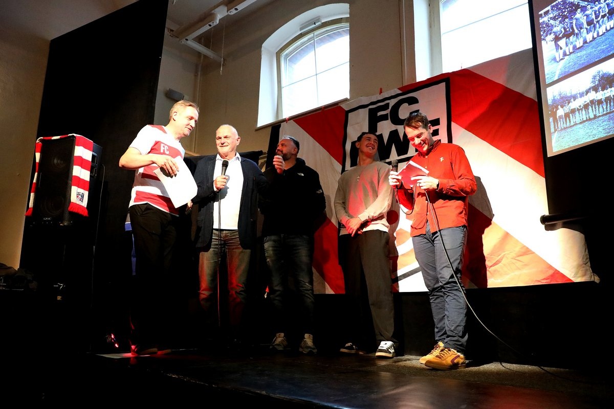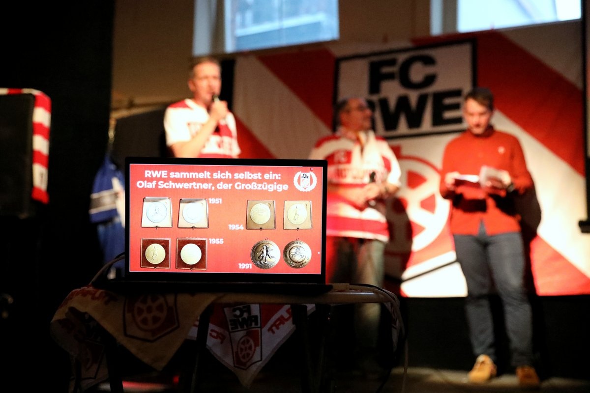 Auch zwei Männer, ohne die Rot-Weiß heute deutlich anders dastünde, wurden gewürdigt: Olaf Schwertner, für seinen großzügigen Verkauf wichtiger Medaillen und Urkunden an Rot-Weiß, und Kurt Gaida, der die von ihm vor der Entsorgung geretteten Pokale und Urkunden an RWE übergab.