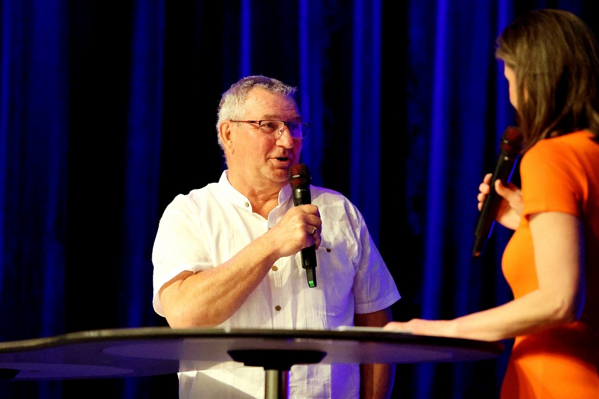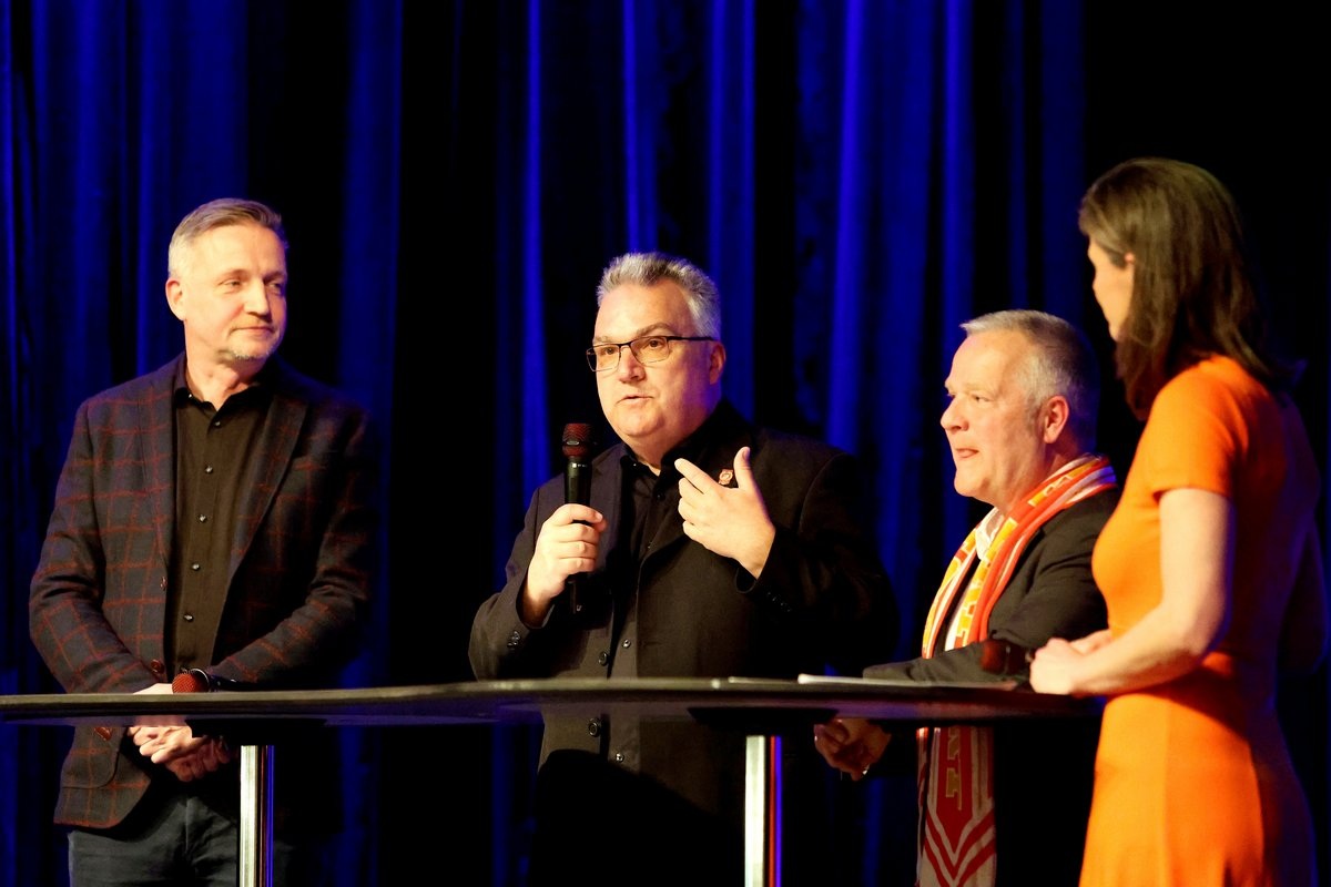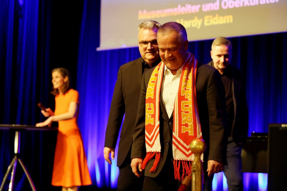Besonders eindrucksvoll wurde es im zweiten Programmblock, als bekannte Erfurter Sportpersönlichkeiten auf der Bühne zu Wort kamen. Mit Cornelia Sirch, Henry Lauterbach, Mario Kummer, Jürgen Heun und Gunda Niemann-Stirnemann waren gleich mehrere Athletinnen und Athleten vertreten, deren Karrieren eng mit der Erfurter Sportgeschichte verbunden sind. Für rot-weiße Momente sorgte dabei nicht nur der Auftritt unseres Ehrenspielführers und „Erfurter Fußballers des Jahrhunderts“ Jürgen Heun, sondern auch der musikalische Einschub „Rot-Weiß sind unsre Farben“.