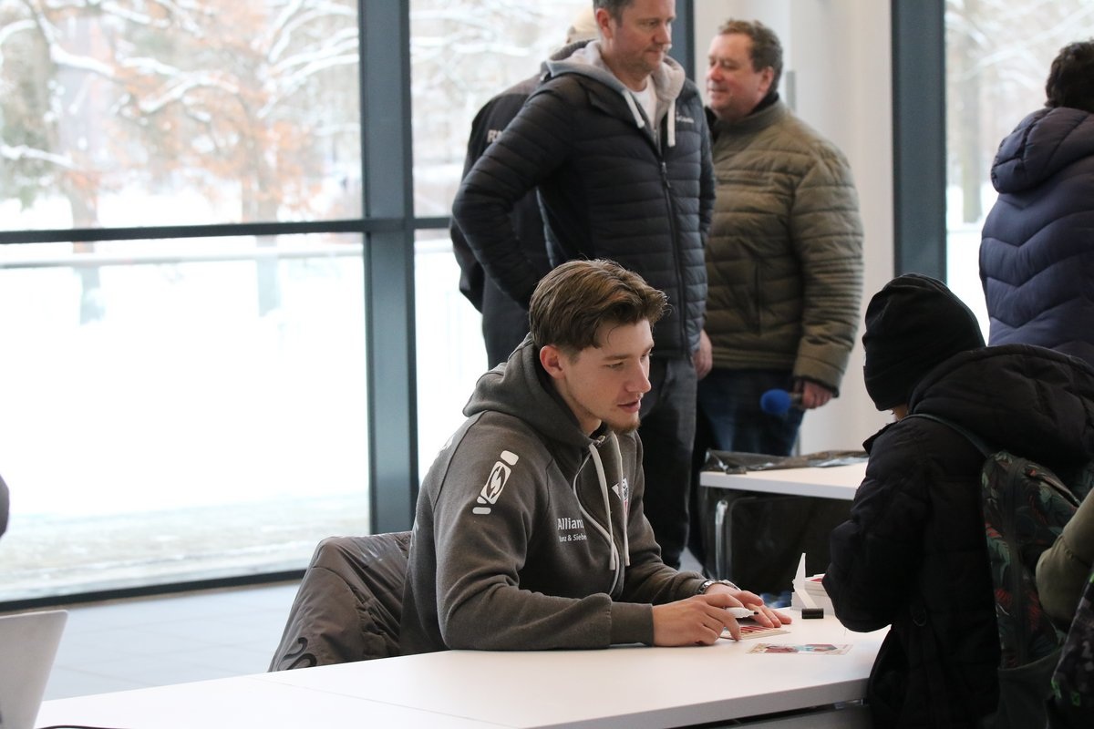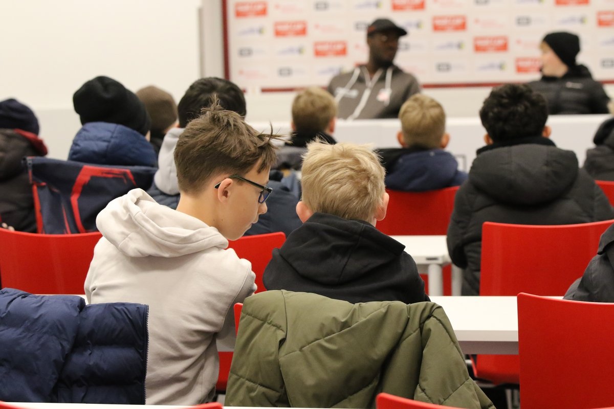Los ging es mit der Erkundungstour durch die moderne Multifunktionsarena. In der Mannschaftskabine wurde jedes Detail genau unter die Lupe genommen – schließlich sitzt man nicht alle Tage auf dem Platz seines Lieblingsspielers. Kaum hatte sich jeder seinen Favoriten ausgesucht, wartete auch schon der nächste Programmpunkt: der Pressekonferenzraum. Dort wurden Benny Boboy, Jaden Rodtnick und Pablo Soares ordentlich mit Fragen gelöchert – von sportlich bis ganz persönlich war alles dabei.