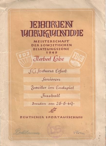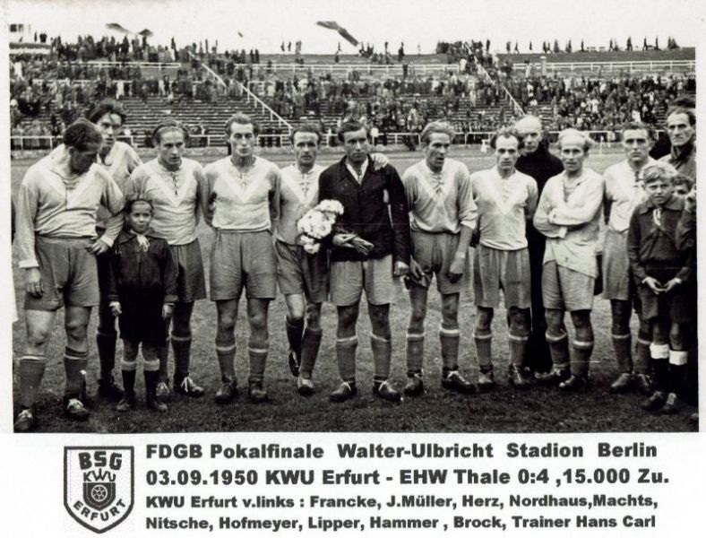 Sportlich gesehen war die bereits erwähnte Finalniederlage der damaligen SG Fortuna Erfurt im Jahr 1949 gegen die ZSG Union Halle dagegen der Beginn der erfolgreichsten Phase des Erfurter Fußballs. Die Mannschaft konnte 1950 das FDGB-Pokalfinale erreichen, verlor dort aber gegen die BSG EHW Thale mit 0:4.